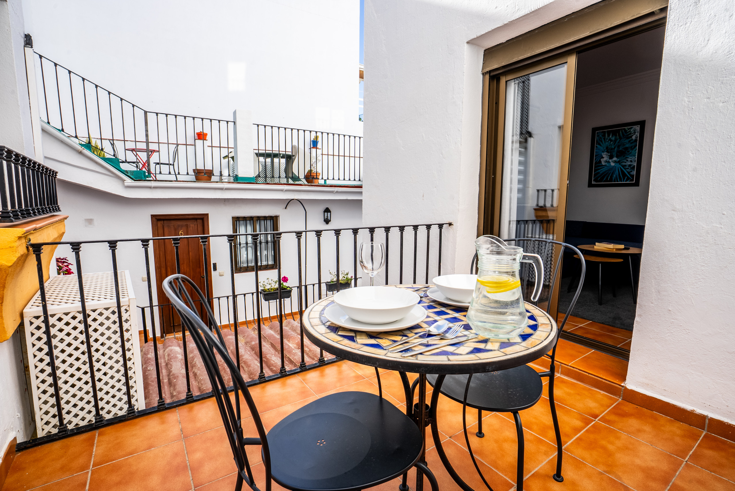 • Terraza privada con vistas a un patio andaluz tradicional, perfecta para el café de la mañana o una copa por la noche