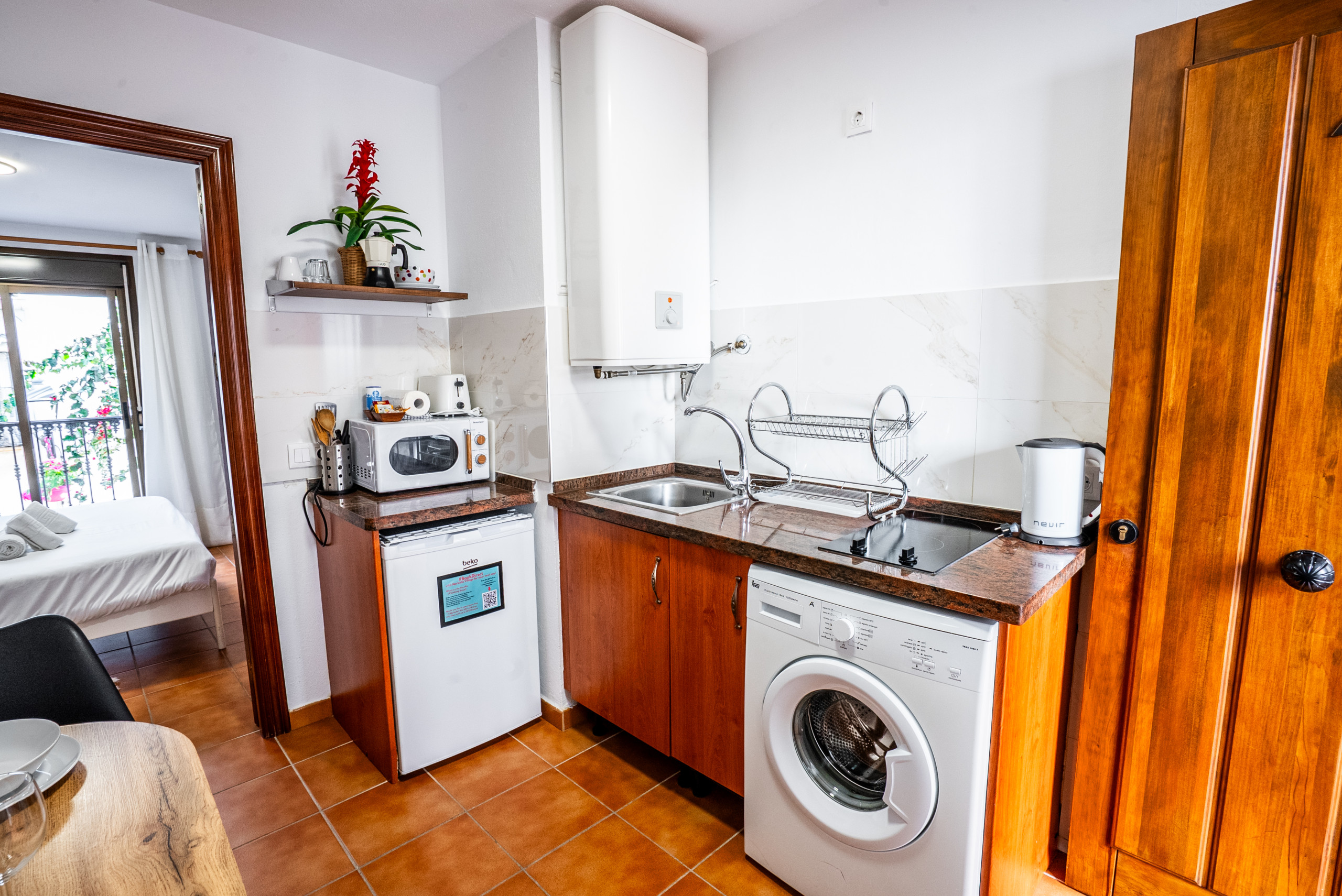 • Cuisine moderne avec plaque électrique, micro-ondes, réfrigérateur-congélateur, machine à café, bouilloire électrique, grille-pain et mixeur
