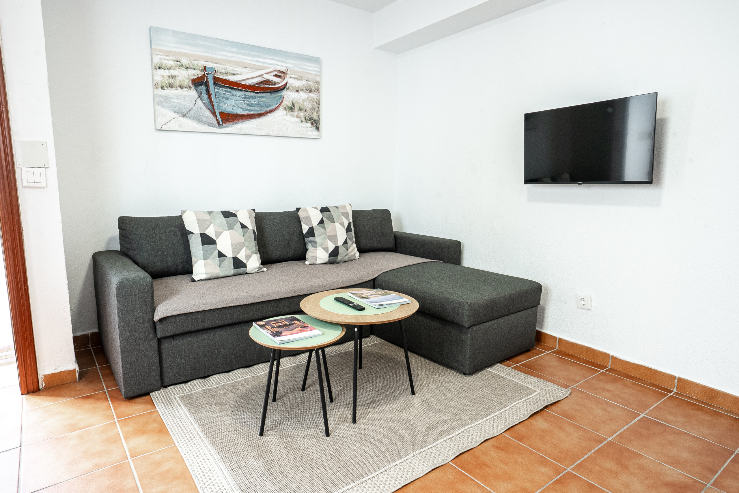 • Ampia zona soggiorno/pranzo con comodo divano letto (140 x 200 cm) e Smart TV a schermo piatto con canali via cavo