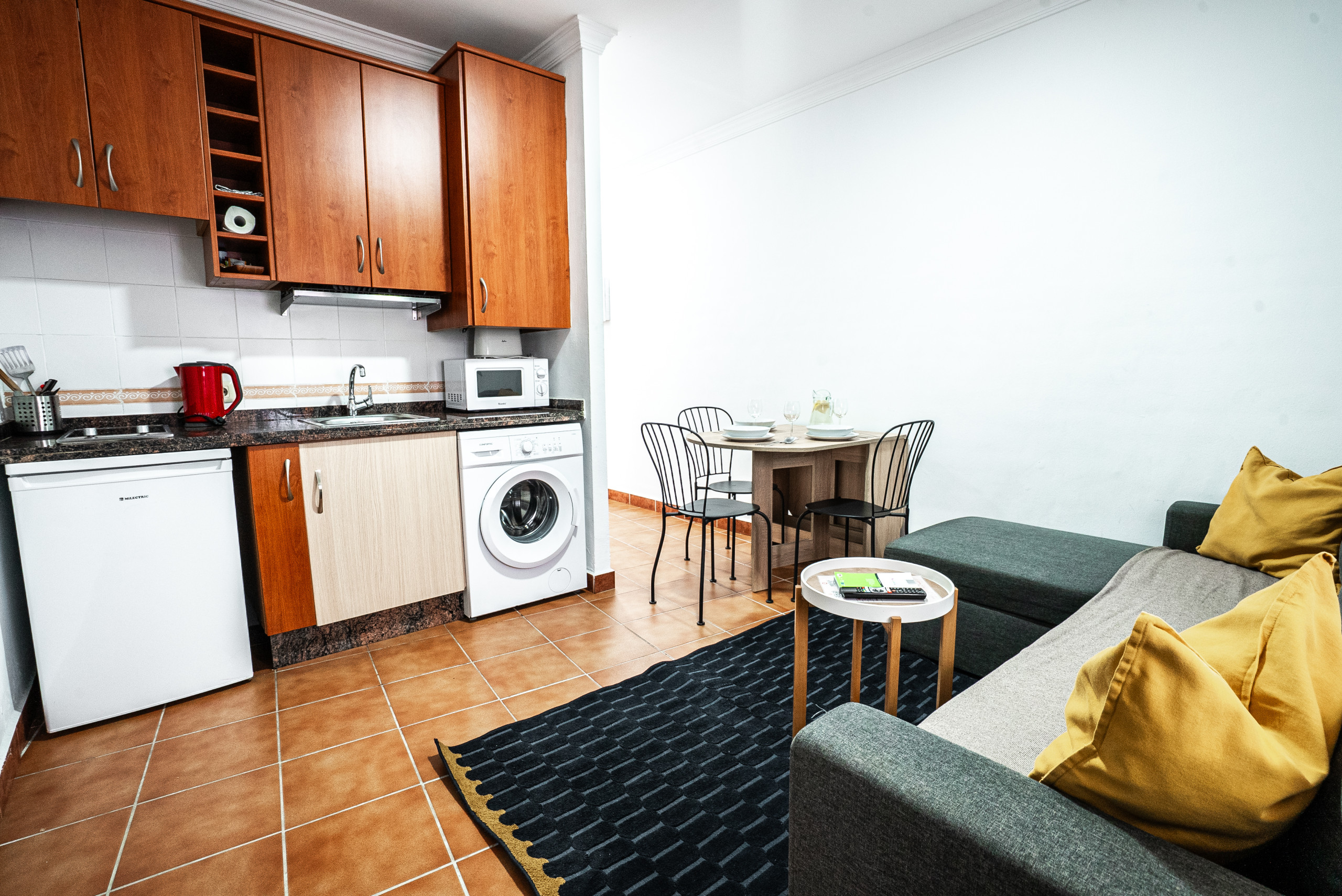 • Cucina completamente attrezzata con piano cottura in vetroceramica, microonde, frigorifero-congelatore, macchina da caffè, bollitore elettrico e tostapane