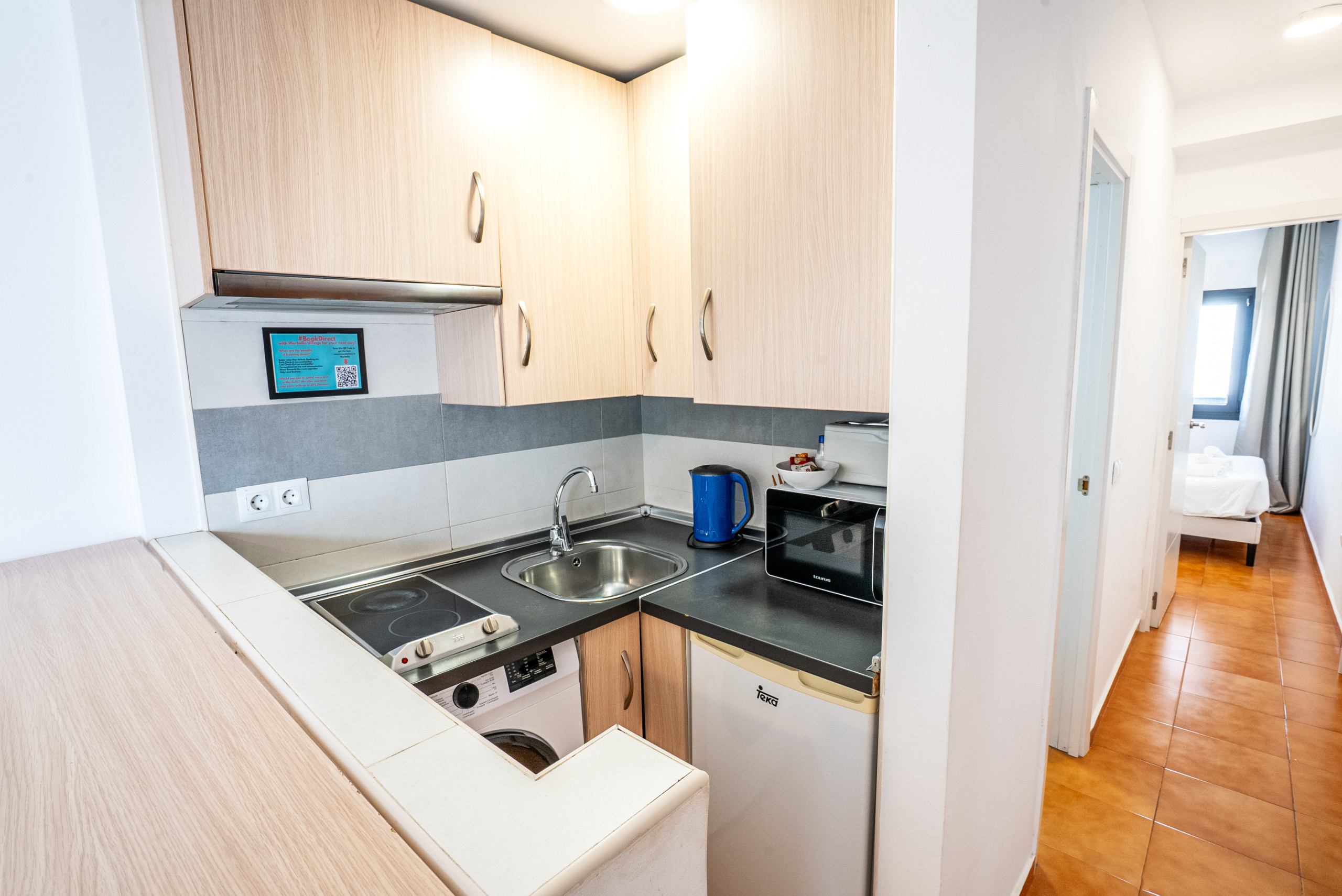 • Cucina completamente attrezzata con piano cottura elettrico, microonde, frigorifero-congelatore, macchina da caffè, bollitore elettrico e tostapane