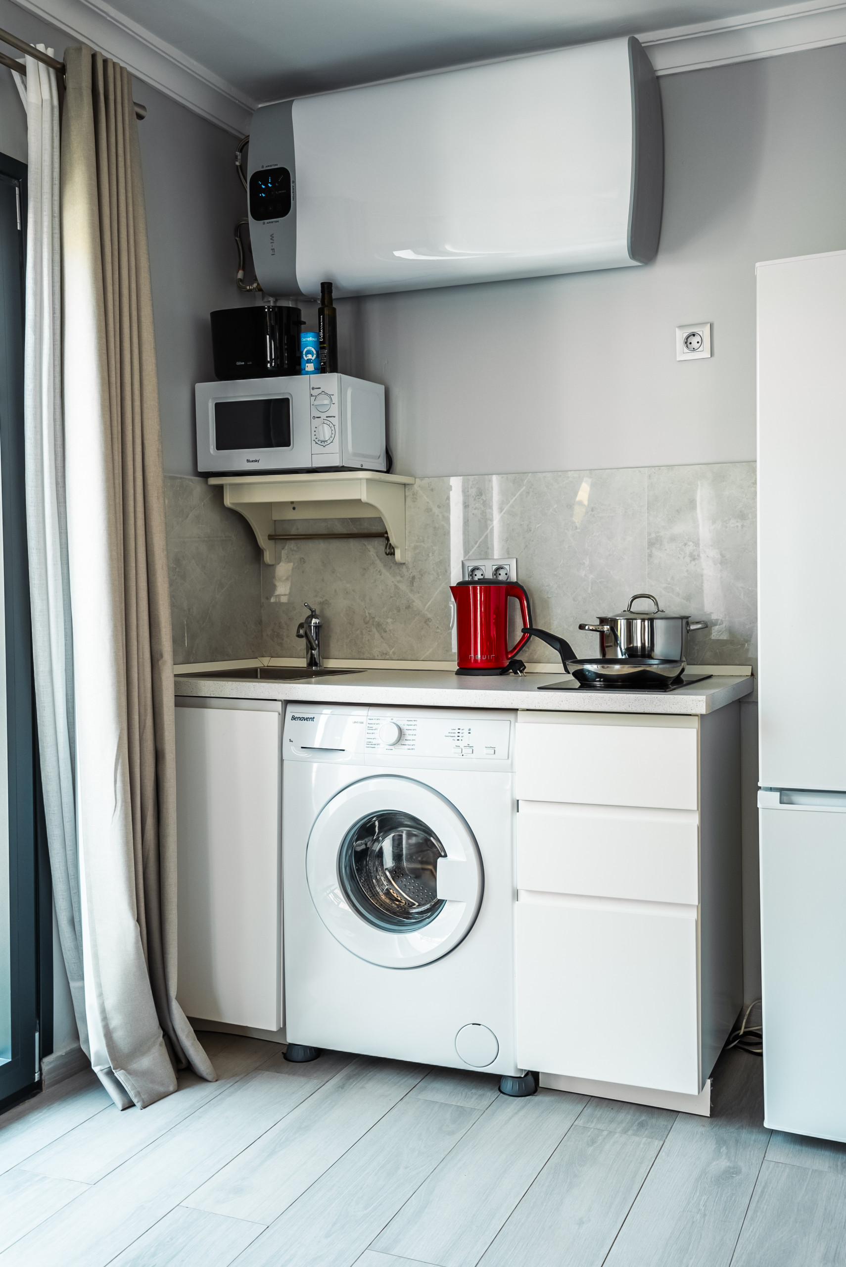 • Cucina moderna con piano cottura elettrico, microonde, frigorifero-congelatore, macchina da caffè, bollitore elettrico, tostapane e mixer